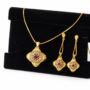 This elegant jewellery set features a beautifully detailed pendant paired with matching drop earrings, finished in a rich gold tone with sparkling stone accents. Perfect for festive occasions or special moments, it adds a graceful and timeless touch to your look.